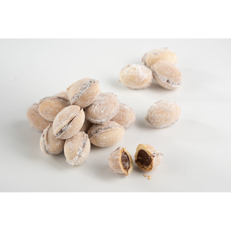 Coji de nuci fragede umplute cu o crema fina din ciocolata si cu mult miez de nuca, glazurate cu zahar, exact ce ne trebuie sa ne amintim de sarbatorile petrecute in familie, de manutele mamei sau a bunicii care pregateau bilute ore in sir. Si noi am pastrat aceeasi traditie de a lucra manual la ele.