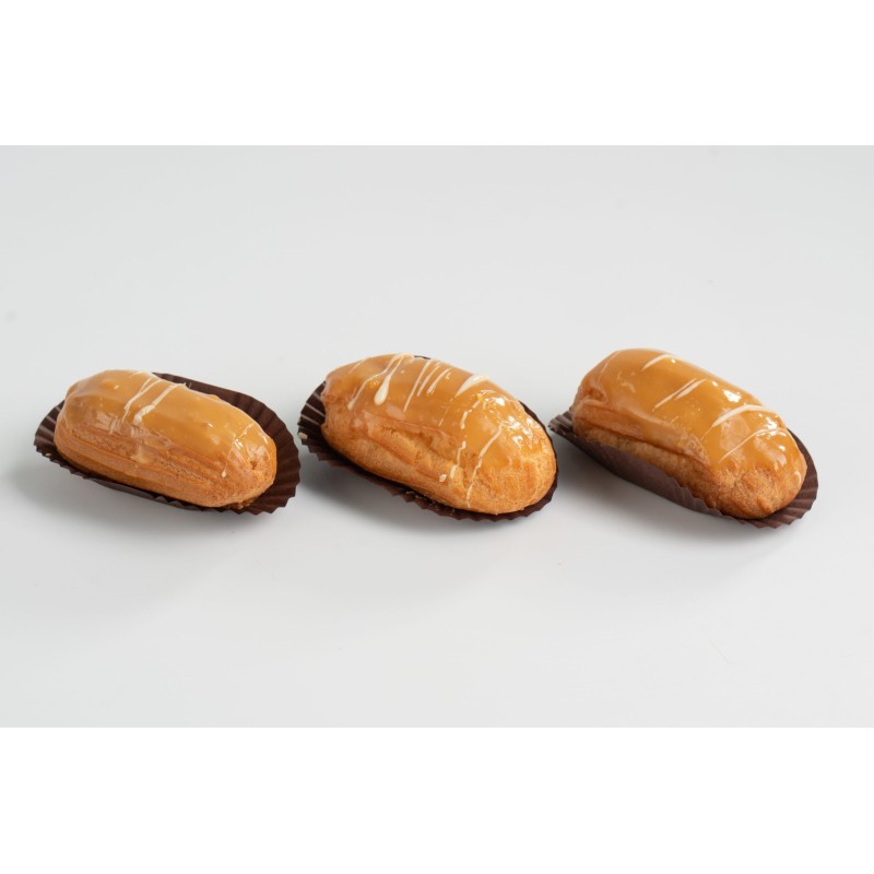 Coji de eclere umplute cu crema chantilly cu caramel si glazurate cu o glazura de caramel, totul pregatit de noi in laborator. Pentru iubitorii de caramel dulce, dar nu prea dulce.