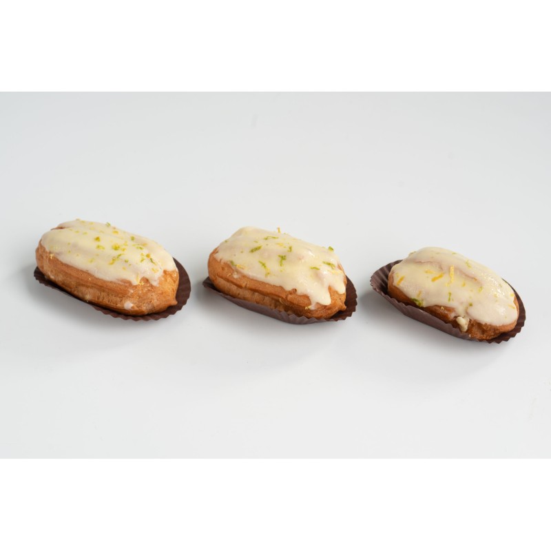 Minieclerele cu lamaie contin coji umplute cu o fina crema de vanilie aromata cu razatura de lamaie bio si glazurate cu ciocolata alba veritabila.