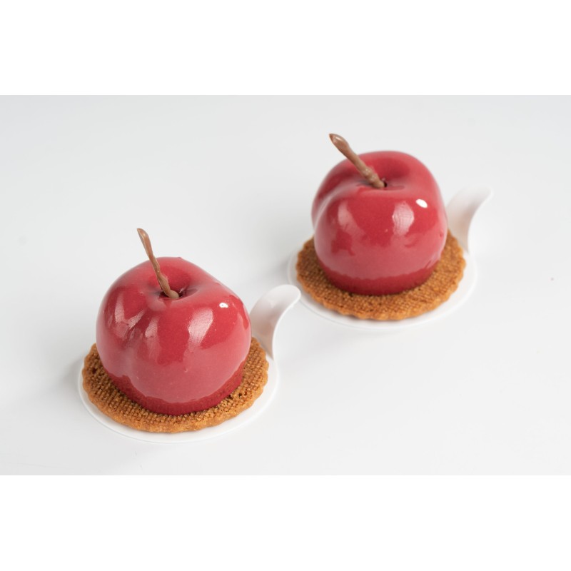 CONTINE: blat lamaie, mousse cheesecake, mere caramelizate, biscuit reusel, glazura de ciocolata sau..